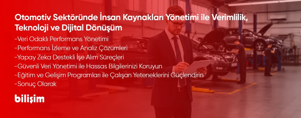 Otomotiv sektöründe insan kaynakları yönetimi, şirketlerin operasyonel verimliliğini artırmasının yanı sıra çalışan memnuniyetini ve bağlılığını da destekler.BilişimHR, veri odaklı performans yönetimi, yapay zeka destekli işe alım ve güvenli veri yönetimi gibi çözümleriyle otomotiv sektörüne özel stratejik avantajlar sunmaktadır.